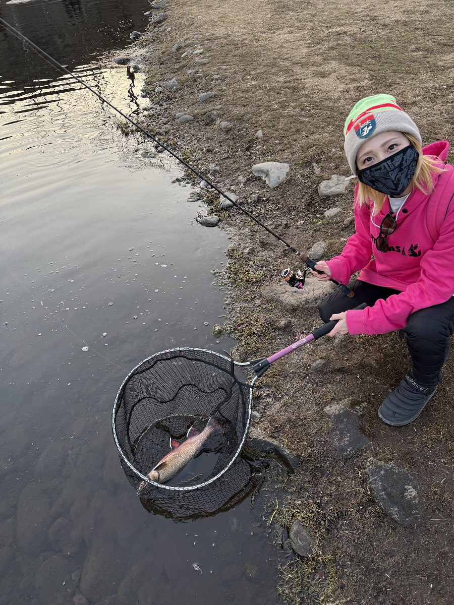 群馬県からお越しのフライマンさん。良型のドナルドソンを釣り上げ満足そうでした。よく見ると、タマゴがこぼれているのはご愛嬌ということで。