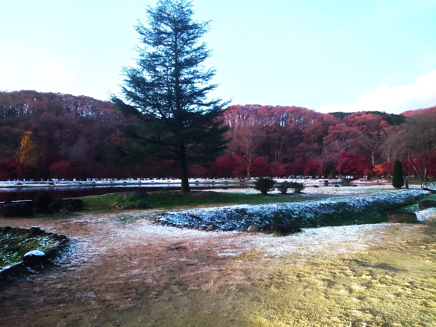 早朝の6:00頃のフィールド内に薄っすら雪が降りていました。初雪ですね、昨日は裏磐梯フォレストスプリングスも朝から雪が降りていました。白河は紅葉になっているのにね。今日は晴れているのですぐに融けてなくなります。