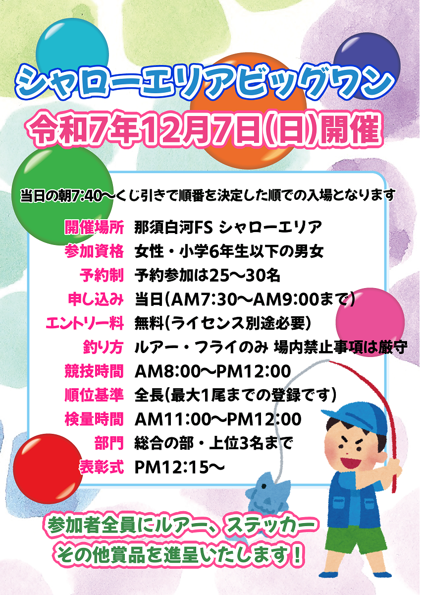 明日、12月7日(日)は「シャローエリアビッグワン」開催の為、エントリーをしていない方はシャローポンドで釣りをすることができません。