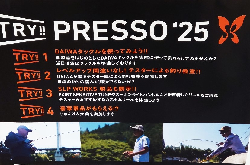 10/18 土曜日にダイワさんのイベントを開催致します。【PRESSO'25】@ダイワのタックルを使って見よう。Aレベルアップ間違いなし!テスターによる釣り教室BSLP WORKS製品も展示C豪華景品がもらえる(じゃんけん大会を実施します) 参加費は無料 予約も必要ありません、当日ダイワ ブースまでお越しください。